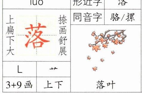 | 落 | luò,形近字:洛,骆/摞 | 一𠃍丨𠃍丿丨𠃍落落落 | 落落大方 | 字义:①掉下来,往下降。②衰败。③遗留在后面。组词:落(落日)(降落)(落叶)(落选)(水落石出)辨字:茫(茫然)(渺茫)(迷茫)(雾茫茫)(白茫茫) | 巧记:有水(氵)又有草(艹),“各”站好位。造句:秋天到了,落叶纷飞,像一只只蝴蝶在翩翩起舞。 |
