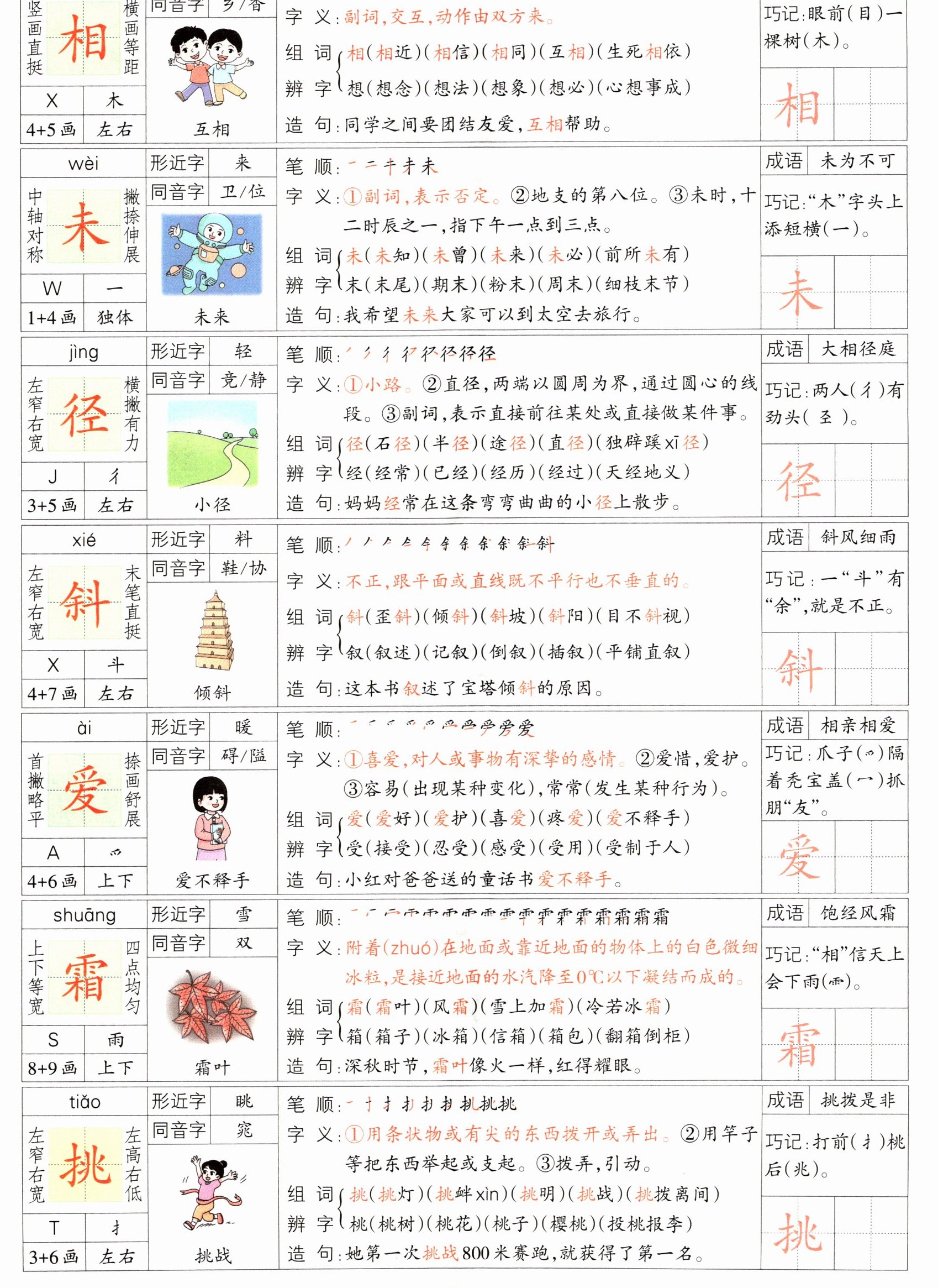| 霜 | shuāng,同音字:双,雪 | 一𠃍丨丨𠃍丨丨𠃍霜霜霜 | 饱经风霜 | 字义:附着在地面或靠近地面的物体上的白色微细冰粒,是接近地面的水汽降至0℃以下凝结而成的。组词:霜(霜叶)(风霜)(雪上加霜)(冷若冰霜)辨字:箱(箱子)(冰箱)(信箱)(箱包)(翻箱倒柜) | 巧记:“相”信天上下雨(雨)。造句:深秋时节,霜叶像火一样,红得耀眼。 |