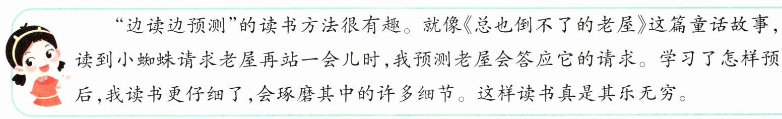 交流心得:读《总也倒不了的老屋》时,读到小蜘蛛请求老屋再站一会儿,我预测老屋会答应。用预测的方法读书,让我更爱思考,觉得读书很有趣。