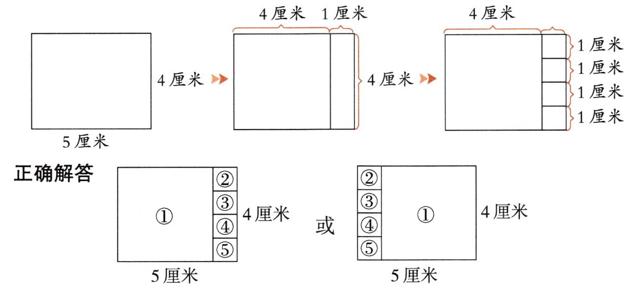 典型例题 将一个长 5 厘米、宽 4 厘米的长方形分割成若干个正方形,怎样分割才能使分割出的正方形的数量最少?分一分。(不能有剩余)