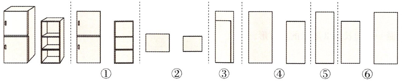 二、乐乐家新买了一台冰箱和一个书架,如图摆放。乐乐从前面开始,顺时针绕两件物品走一圈,可以依次看到下面哪些图形?不可能看到哪些图形?(5分)
