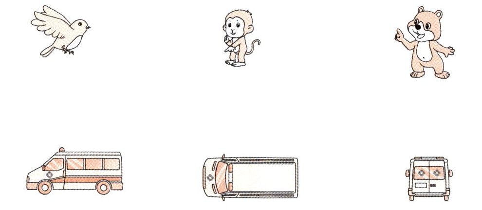 二、小象在百米赛跑中受伤了。小鸟站在树上打电话叫来了救护车,停在小猴的旁边,小熊在车后面大声喊:“让小象从这里上车。”它们各自看到了什么?连一连。(空间观念)(6分)