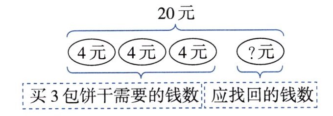 壮壮的 20 元包括买 3 包饼干需要的钱数和应找回的钱数,如下图所示。