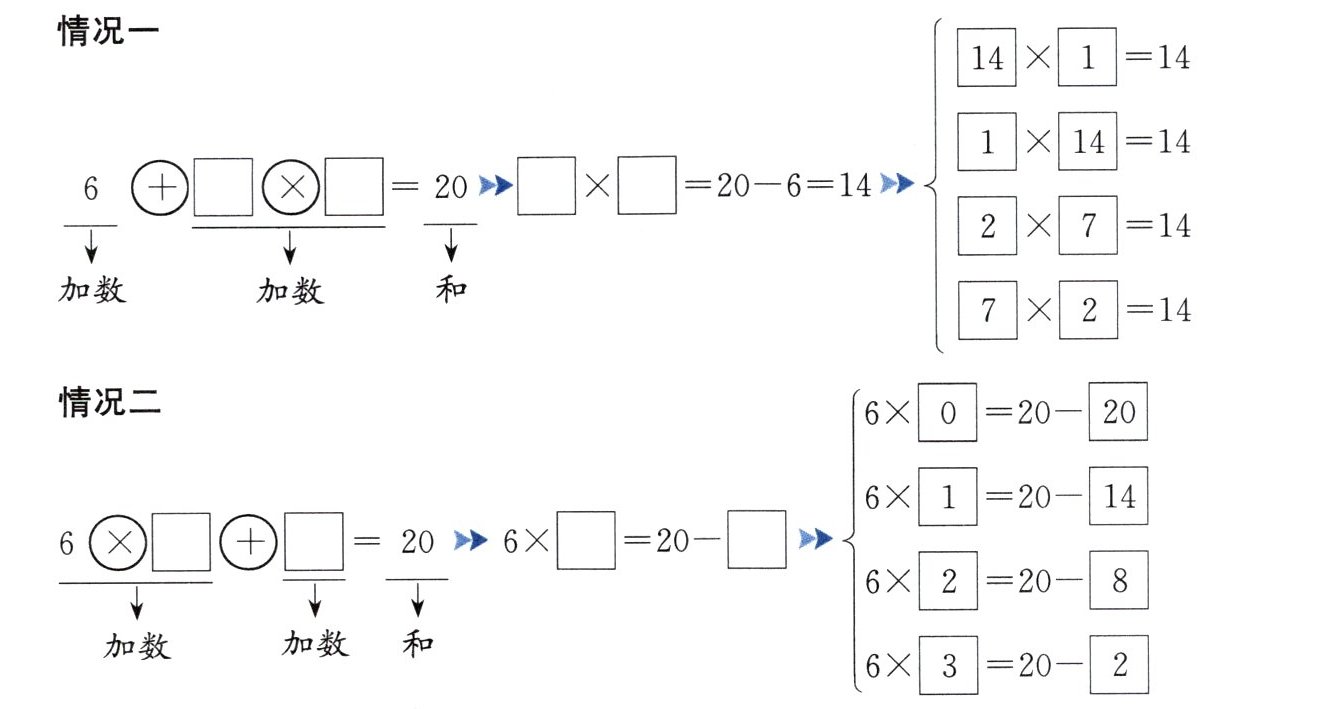 典型例题 在一个 $◯$ 里填上“+”,在另一个 $◯$ 里填上“×”,在 $□$ 里填上合适的数,使等式成立。