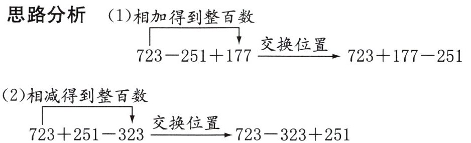 方法提示 在没有括号的加减混合运算中,为了使计算简便,可以交换加数、减数的位置,但一定要带着前面的运算符号一起交换位置。