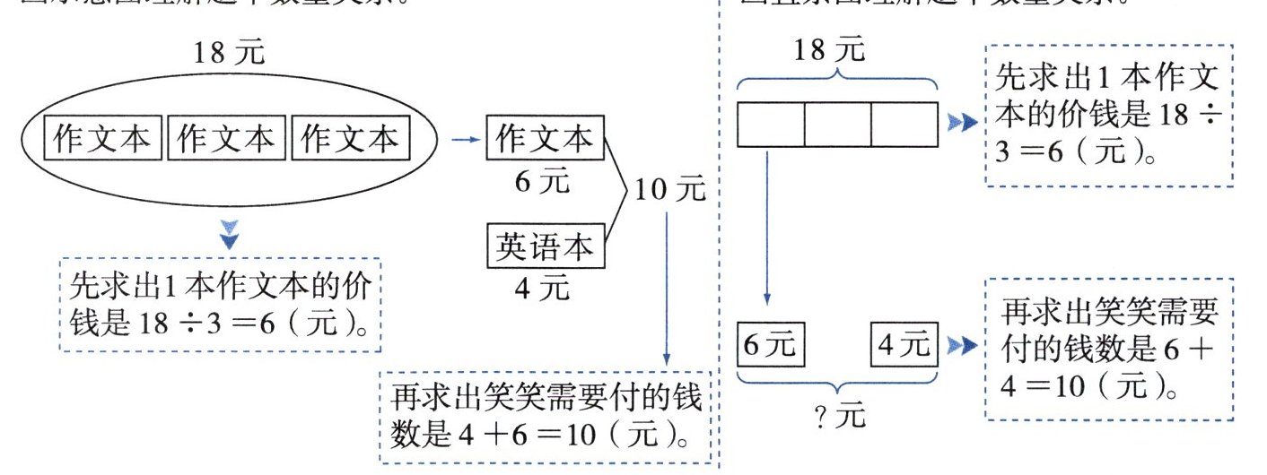 解题时,先求出 1 本作文本的价钱,再求出笑笑需要付的钱数。因此,两个算式都先算除法,再算加法。