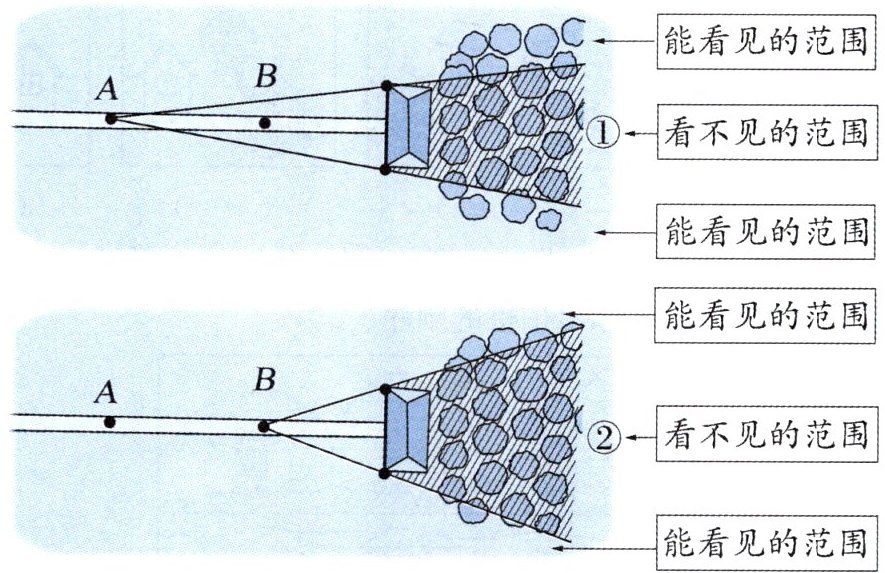 方法总结 观察物体时,离遮挡物越远,观察到的范围越大;离遮挡物越近,观察到的范围越小。