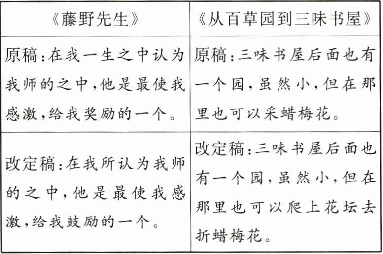 《藤野先生》:将"在我一生之中认为我师的之中"改为"在我所认为我师的之中",删繁就简,语言变得简洁精练;将"给我奖励"改为"给我鼓励",细心斟酌,务求准确严密。《从百草园到三味书屋》:将"但在那里也可以采蜡梅花"改为"但在那里也可以爬上花坛去折蜡梅花",动作更具体,更加生动形象;将"采"改为"折",用词更加准确,表现出孩子活泼好动的特点。