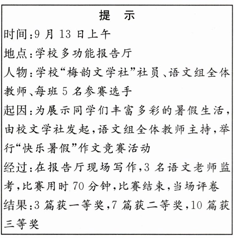 这次活动由学校“梅韵文学社”发起,由语文组全体教师主持,旨在展示同学们丰富多彩的暑假生活。这次比赛,每班限派5名选手,在报告厅现场写作,限时70分钟,由3名语文老师监考。比赛结束,由学校全体语文老师当场评卷,当场宣布比赛结果。各班选手经过激烈比拼,最终决出结果:3篇获一等奖,7篇获二等奖,10篇获三等奖。