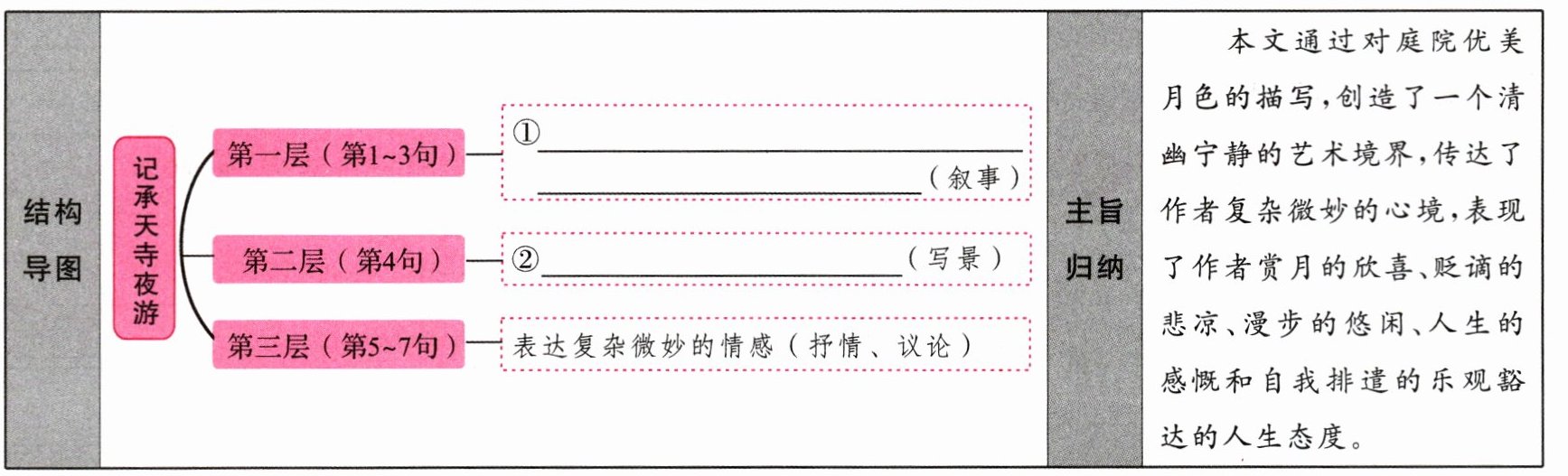 ①交代夜游的时间、地点、缘由及同游者 ②描绘了月夜庭院中的美景