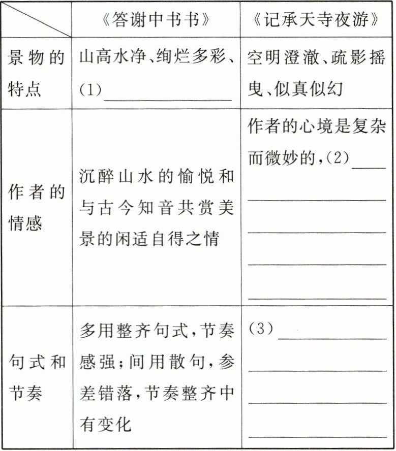 (2)哪一夜没有月光?哪里没有竹子和柏树?只是缺少像我俩这样的闲人罢了。