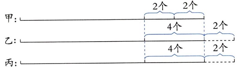 根据上图可知,重新分配后,甲后来拿到的 4 个气球分别来自乙和丙,且乙和丙拿出的气球数量相等。根据乙、丙拿出的气球数量与乙、丙每人要给甲的钱数即可求出每个气球的价钱。