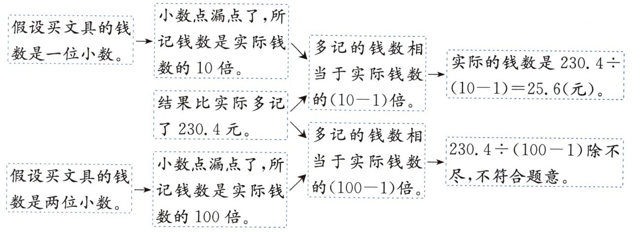 典型例题 婷婷在记账时,不小心把自己买文具的钱数的小数点漏点了,结果比实际多记了 230.4 元。婷婷买文具花了多少元?