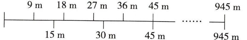 9 和 15 的最小公倍数是 45,则每相邻两棵不需要移动的树之间的距离是 45 m,因此有 $(945÷45 + 1)$棵树不需要移动。