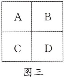 思路分析 先画一个被四等分的正方形,在方格中分别标上 A,B,C,D 四个字母,如图三所示,再用平移或旋转的知识描述把图片①②③④放置到对应字母处的过程。