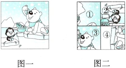 典型例题 下面的图一被分成四块并打乱顺序摆成图二,怎样把图二还原成图一?说一说你的操作过程。