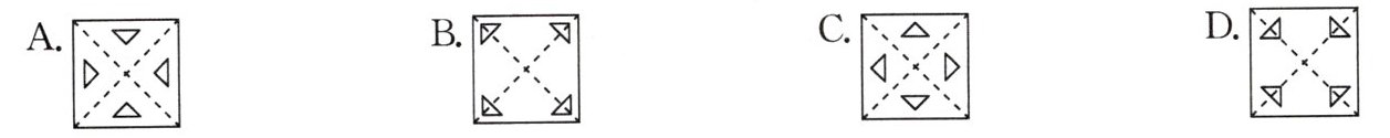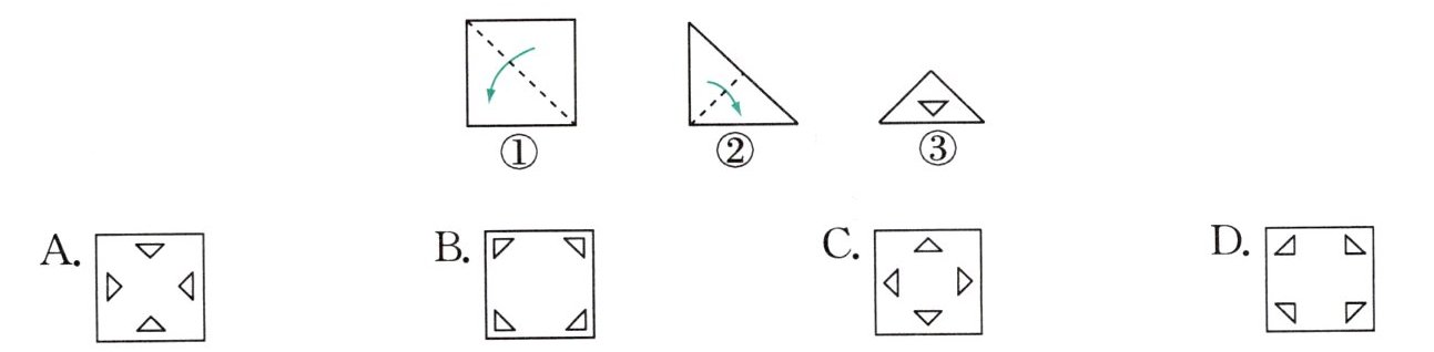 典型例题 如下图所示,把一张正方形纸按图①、图②所示的方式对折两次后,再按图③所示的方式剪一个三角形小孔,展开后得到的图形是( )。