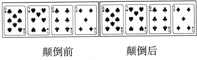 一、如下图,王老师把四张扑克牌放在桌子上,并背过身去,请小强把其中一张扑克牌颠倒过来。王老师转回身看扑克牌,很快就猜出了是哪一张扑克牌被颠倒了,你来猜一猜。(4分)