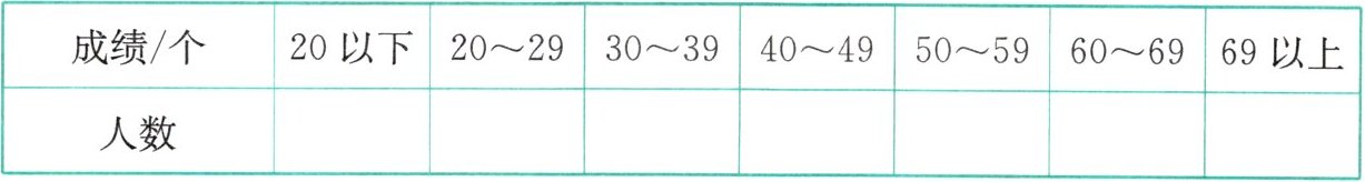 | 成绩/个 | 20 以下 | 20~29 | 30~39 | 40~49 | 50~59 | 60~69 | 69 以上 |