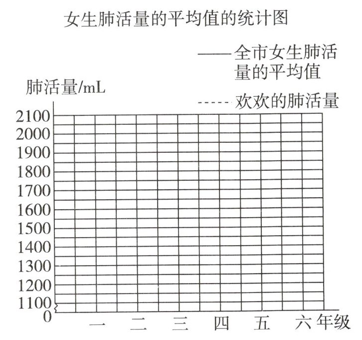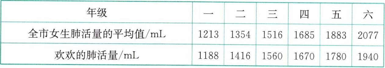 (3)欢欢的肺活量在一年级至二年级增长最快,与全市女生肺活量的平均值的增长情况不一致。