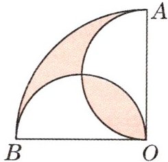 典型例题** 如右图,$ OA$,$ OB$ 分别是小半圆的直径,且 $ OA = OB = 6\ cm$,$ \angle BOA = 90^{\circ}$,阴影部分的面积是多少平方厘米?