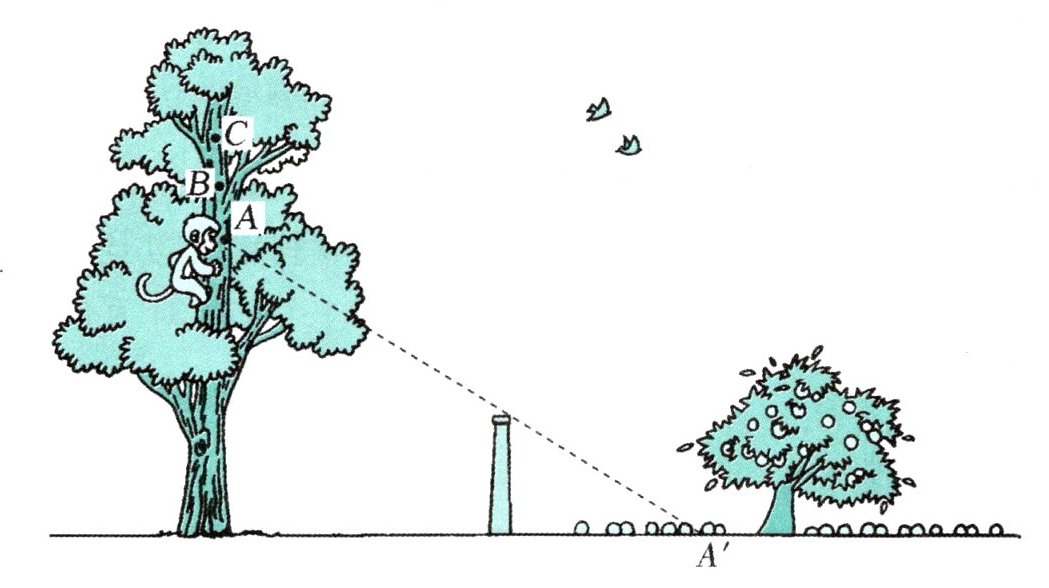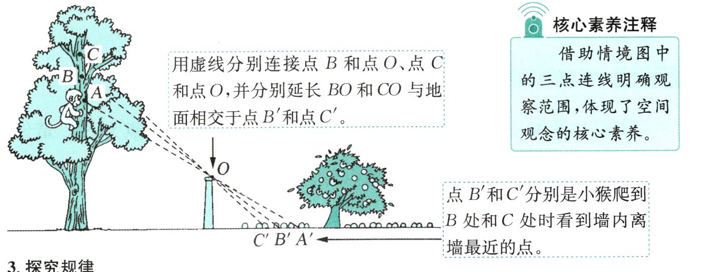 问题(1)导入 小猴在树上 A 处时,看到墙内离墙最近的点为 $ A' $。请你分别画出小猴爬到 B 处和 C 处时,看到墙内离墙最近的点 $ B' $和 $ C' $。(教材 34 页例题)