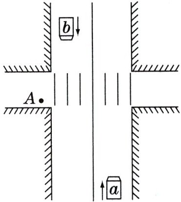 如图所示,乐乐在点A正对马路时能看到马路上的汽车b,不能看到汽车a。为了安全通过人行横道,我们应该遵守交通规则,在路口仔细观察来往车辆,确认安全后再通过。