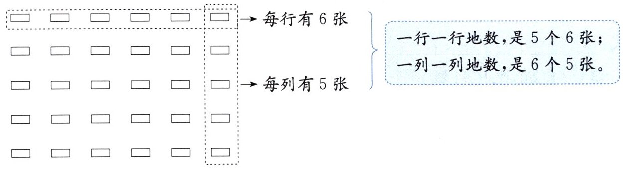 典型例题 二年级一班教室里的桌子摆成了一个方阵。横着数,每行有6张;竖着数,每列有5张。二年级一班教室里一共有多少张桌子?