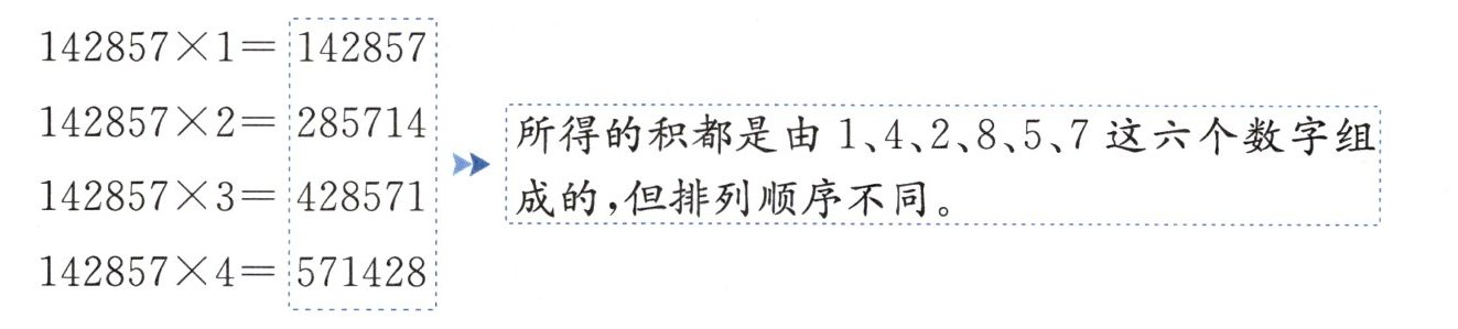 发现:142857 乘 1、2、3、4、5、6 所得的积仍由 1、4、2、8、5、7 这六个数字按一定的顺序排列组成。