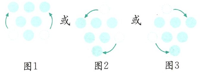 思路分析 观察上图,它是由 6 个小圆片组成的,根据题意可知,只能移动 2 个小圆片,所以有 4 个小圆片不能移动。可以把三角形第三行两端的 2 个小圆片移至第一行;也可以把第一行的小圆片移至中间一行的左(或右)边,把第三行右(或左)边的小圆片移至下一行,如下图所示: