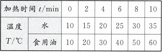 (填“大于”“小于”或“等于”)食用油吸收的热量。|加热时间 $ t/min $| 0 | 2 | 4 | 6 | 8 | 10 |