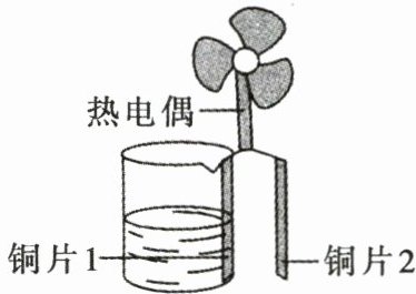 13. 【物理学与社会发展】用两块铜片、热电偶、电动机(带风扇)组成一个电路,铜片1插在90℃热水中,铜片2放在空气中,如图所示,半分钟左右风扇发生转动,这就是温差发电现象。温差发电的实质是