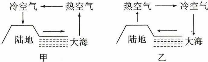 10. 沿海线地区炎热晴朗的天气里,易形成海陆风,陆风和海风是由于地面和大海升温和降温的快慢不同,从而使空气对流形成的。如图所示的是陆风和海风形成的示意图,