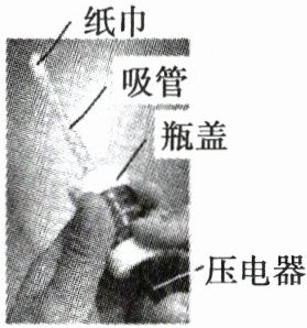 ④在吸管口塞上纸巾,拧开瓶盖,向容器内喷适量酒精,拧上盖子,按压压电器,纸巾被推出去。