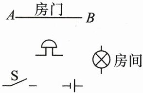 11.(局部短路型)“创新”实验小组的同学要设计一个自动防盗报警电路。要求:晚间开关 $ S $ 闭合后,灯亮电铃不响;当房门被打开时,细导线 $ AB $ 被扯断,灯亮且电铃发声自动报警。请按要求用直线连接如图所示的电路元件。