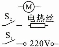 10.(开关并联型)家用电吹风由电动机和电热丝(定值电阻)等组成。为了保证电吹风的安全使用,要求:只闭合 $ S_1 $,电动机工作,电热丝不工作;只闭合 $ S_2 $,电动机和电热丝都不工作;同时闭合 $ S_1 $、$ S_2 $,电动机和电热丝都工作。请补画完符合要求的电路图。