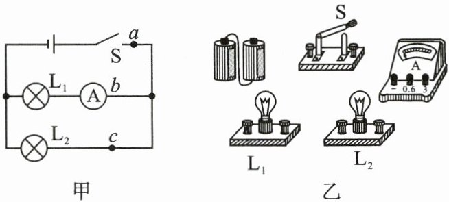 (1)于是他设计了如图甲所示的电路(此时电流表在 b 点),请你帮他在图乙中用笔画线代替导线将实物图连接完整。