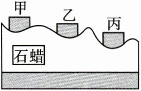 13. 将质量相同、材料不同的三块金属甲、乙、丙,加热到相同的温度后,放到表面平整的石蜡上。经过一段时间后,观察到如图所示的现象。由此可分析得出三块金属中