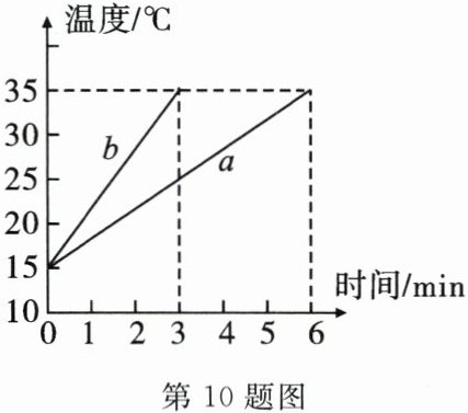 10. (宜昌市中考)在两个相同的烧杯中分别装有质量和初温相同的水和某种液体,用两个完全相同的电加热器对其加热,每隔一段时间用温度计分别测量它们的温度,并画出了温度随时间变化的图像如图,由图像可知(