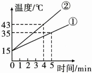 (1)解:由图可知①为水的升温图线5min 内水升温$\Delta t=35^{\circ }C-15^{\circ }C=20^{\circ }C$,水吸热:$Q=cm\Delta t=4.2×10^{3}J/(kg\cdot ^{\circ }C)×0.2kg×20^{\circ }C=1.68×10^{4}J$