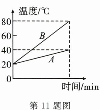 11. 用相同的电加热器分别对质量相等的$A和B$两种液体进行加热,如图所示的是$A和B$的温度随加热时间变化的图像,则$A$的比热容