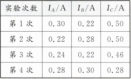 的电流。(2)该小组同学换用不同规格的小灯泡进行实验,用电流表多次测$A$、$B$、$C$三点电流,记录实验数据如下表。