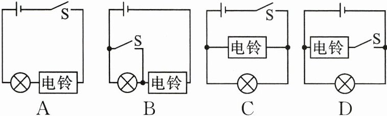 6.(天津市中考)某兴趣小组要为居家老人设计一个“应急呼叫器”电路,要求:开关断开时,电灯和电铃均不工作;开关闭合时,灯亮铃响,即使电灯因断路不亮,电铃仍可工作。如图所示的电路中,符合设计要求的是(