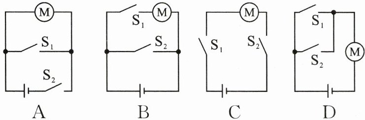 7.【物理学与社会发展】经过火车站的自动检票闸机时,乘客只需刷一下身份证,然后面对摄像头进行人脸识别,两种信息都确认后系统就会提示检票通过,闸机门自动打开。若身份证和人脸识别系统各相当于一个开关,信息符合为开关闭合状态,则下列模拟电路中,符合上述要求的是(