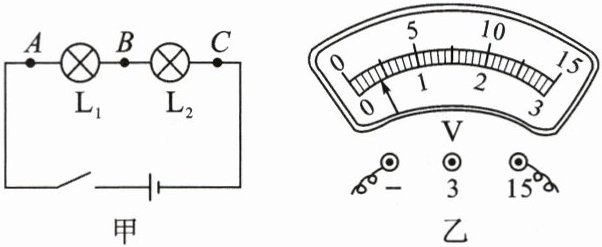 (选填“相同”或“不相同”)。(2)闭合开关后,小明发现两灯都不发光,于是分别把电压表接在图甲中A和B两点、B和C两点及A和C两点,测得数据分别是Uₐₙ = 3V,Uₙₙ = 0V,Uₐₙ = 3V;小明检查发现只有灯$L_1$和灯$L_2$中的一盏出现故障,则故障可能是