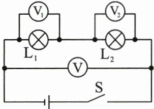 1. 如图所示,在探究“串联电路电压的关系”时,闭合开关S后,电压表$V_1$的示数是$2.5V,V_2$的示数是3.9V,则电压表V的示数是(
