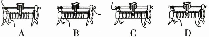 2. (内江市中考)如图所示,给出了滑动变阻器四种接入电路的结构示意图。其中,当滑片P向左滑动时,使连入电路中的电阻变大的接法是(