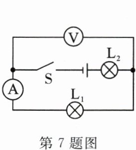 7. 如图所示,电源电压不变,闭合开关S,灯泡$L_1、$$L_2$都发光。一段时间后,由于某个灯泡发生故障,使两灯都熄灭,且电流表示数为零,电压表示数变大,则下列说法正确的是(