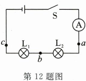 12. 如图所示电路,闭合开关S后,两灯均不发光。为检测电路故障,泽华做了以下操作:将一根导线两端接到a、b两点,发现灯$L_1$亮,电流表有明显示数;将这根导线两端分别接到b、c两点,发现两灯均不亮,电流表示数为零。则电路故障可能是(