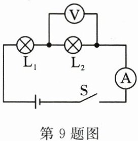 9. 如图所示的电路中,灯$L_2$的灯丝断了,则(